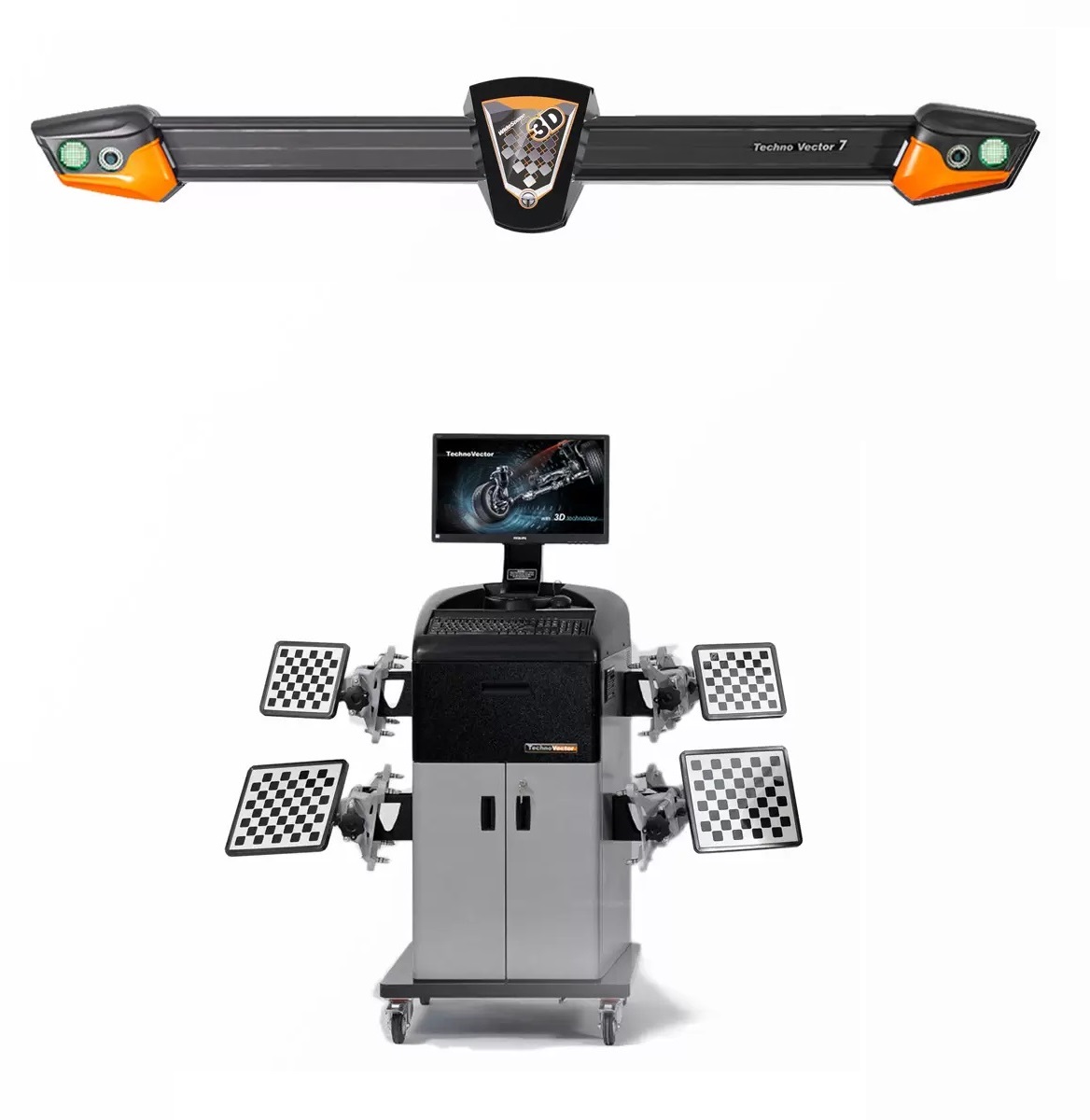 Стенд 3D настенный ТехноВектор 7 Т7202 KAB (стойка "Т"-серии), (для работы на яме) предназначен для измерения и регулировки углов установки управляемых и неуправляемых колес автомобилей в условиях автотранспортных предприятий, станций технического обслуживания, автомобильных заводов и диагностических центров.